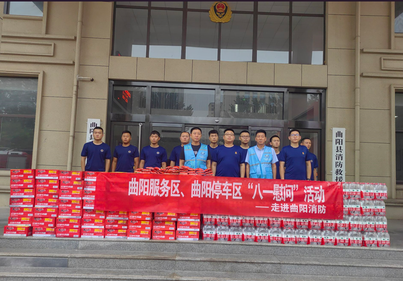 2023年8月1日,在第96个建军节来临之际,曲阳停车区、曲阳服务区走进曲阳消防大队,带着对人民子弟兵的深厚感情,为炎热酷暑中坚守在一线岗位的消防救援人员送去慰问,并致以节日的祝福和诚挚的问候。 两位经理高度赞扬了消防救援人员们在抗洪抢险、灭火救灾等急难险重的任务方面赴汤蹈火、舍身忘死的精神,并表示将一如既往的支持消防工作、学习和宣传消防知识,争做遵守消防安全的模范单位。 马子原队长代表全体消防救援人员对服务区领导的到来表示热烈欢迎,向服务区多年来关心、支持消防事业表示衷心的感谢,并表示在以后的工作中,进一步提升应急救援能力和消防执法水平,更好地服务社会、服务百姓,改制不改本色,争做舍身为民的逆行英雄。 此次慰问活动增进了彼此情谊,体现了鱼水情深、团结一家亲的良好氛围。