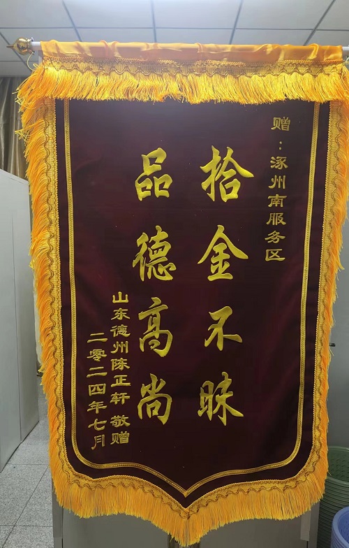 7月21日晚18点40左右,涿州南服务区餐厅职工打扫卫生做保洁时,发现桌子上有一手机并及时上报涿州南服务区办公室,值班人员到餐厅后正愁如何联系失主时,突然这只手机的电话铃声响起,“喂,您好,这是哪里?”原来是失主拨打的电话。 值班员告知机主手机遗落在了涿州南服务区,失主这才放心,机主表示手机等同于我们的身份证,里边存储大量私人信息,极其重要。因机主着急回家,距离较远,双方添加微信好友后失主要求服务区将手机快递邮寄到目的地。 7月30日下午,失主为了表达对涿州南服务区的诚信善举,将绣着“品德高尚 拾金不昧”的锦旗送到了服务区,表示诚挚谢意。
